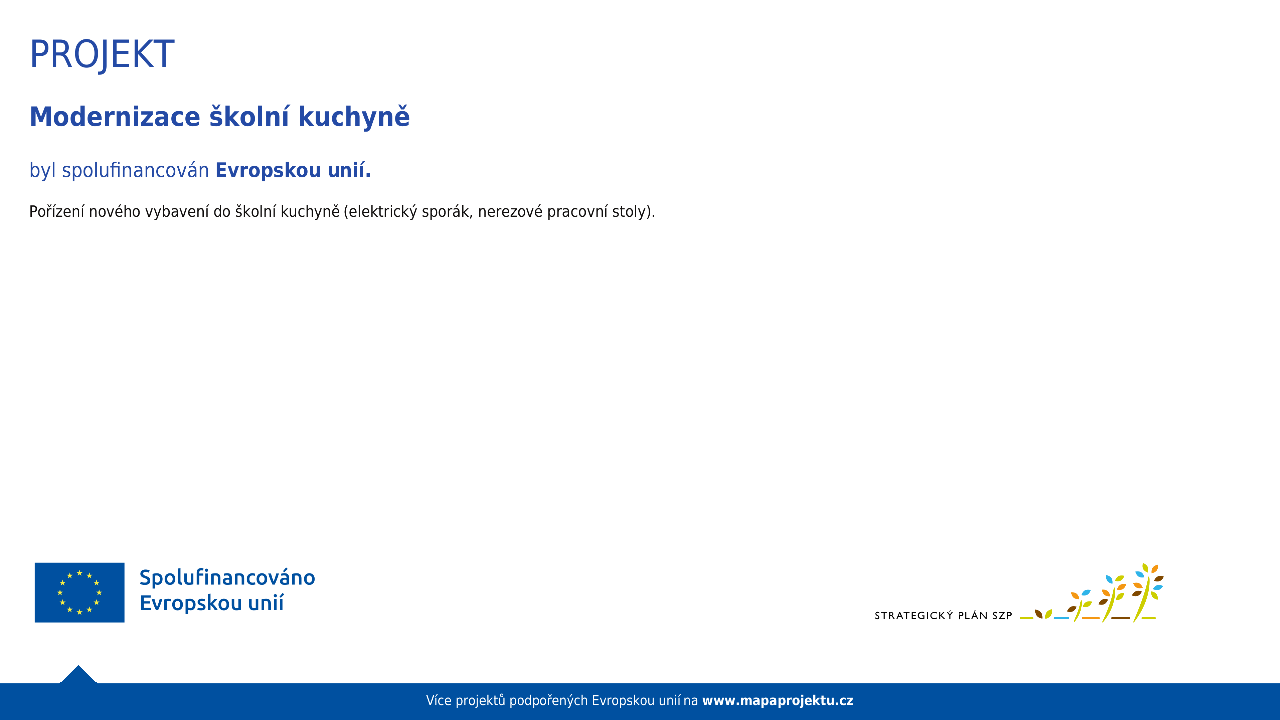 Díky dotaci Státního zemědělského intervenčního fondu (SZIF) ve výši 80% z celkové částky 160.962,- Kč jsme mohli pořídit nové vybavení do naší školní kuchyně: elektrický sporák a dva nerezové pracovní stoly. Projekt je spolufinancován Evropskou unií.